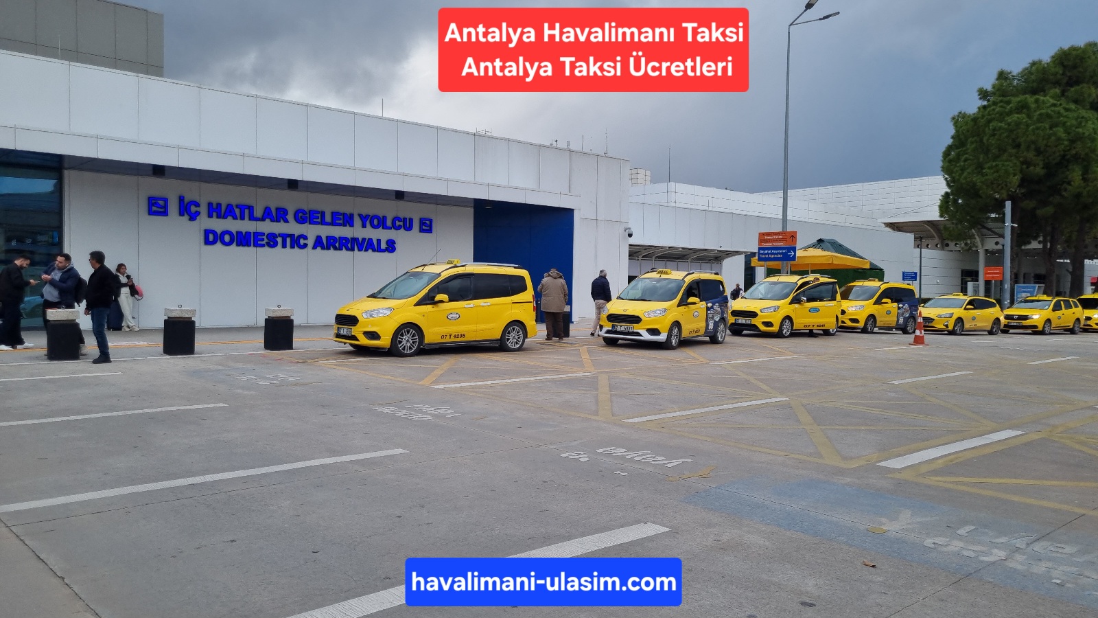 Antalya Havalimanında Taksiler, Antalya Havalimanı İç Hatlar Terminali, 1. Dış Hatlar Terminali (T1) ve 2. Dış hatlar Terminali (T2) önündeki taksi duraklarında faaliyet göstermektedir.